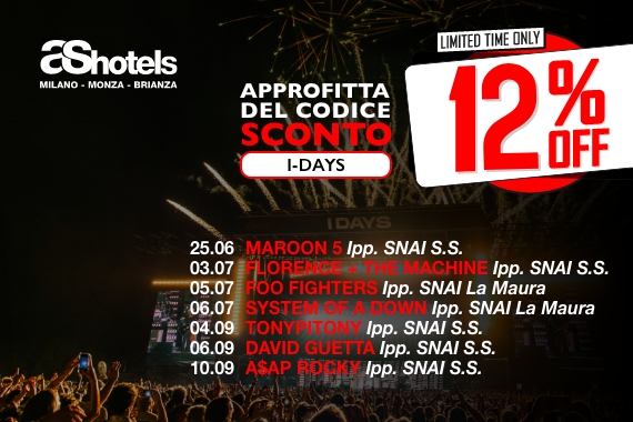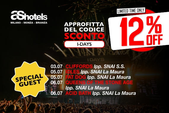 Scegli l’hotel che ti è più comodo e prenotando online inserisci il CODICE SCONTO: I-DAYS oppure se prenoti telefonicamente, comunicalo al nostro Centro Prenotazioni.